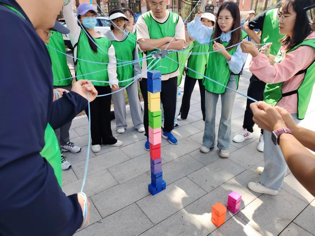 上午8:30,教师们脸上洋溢着笑容从学校出发,到达平山后,校工会副主席苗慧介绍了本次活动的目的和意义。在随机分组后,正式进入游戏环节。教师们充分发挥才智、比拼技巧和体能,进行了旱地龙舟、大力投篮、技巧盖楼、水果连连看等游戏,将团队合作意识展示得淋漓尽致。伴随着加油呐喊声,各队教师均完成游戏,每一项游戏的完成都是对自我能力及团队配合的完美诠释,也让教师们感受到坚持、信任与配合的意义。最后,所有教师围成圆圈,在“团队有我更精彩”的口号中结束了上午的活动。